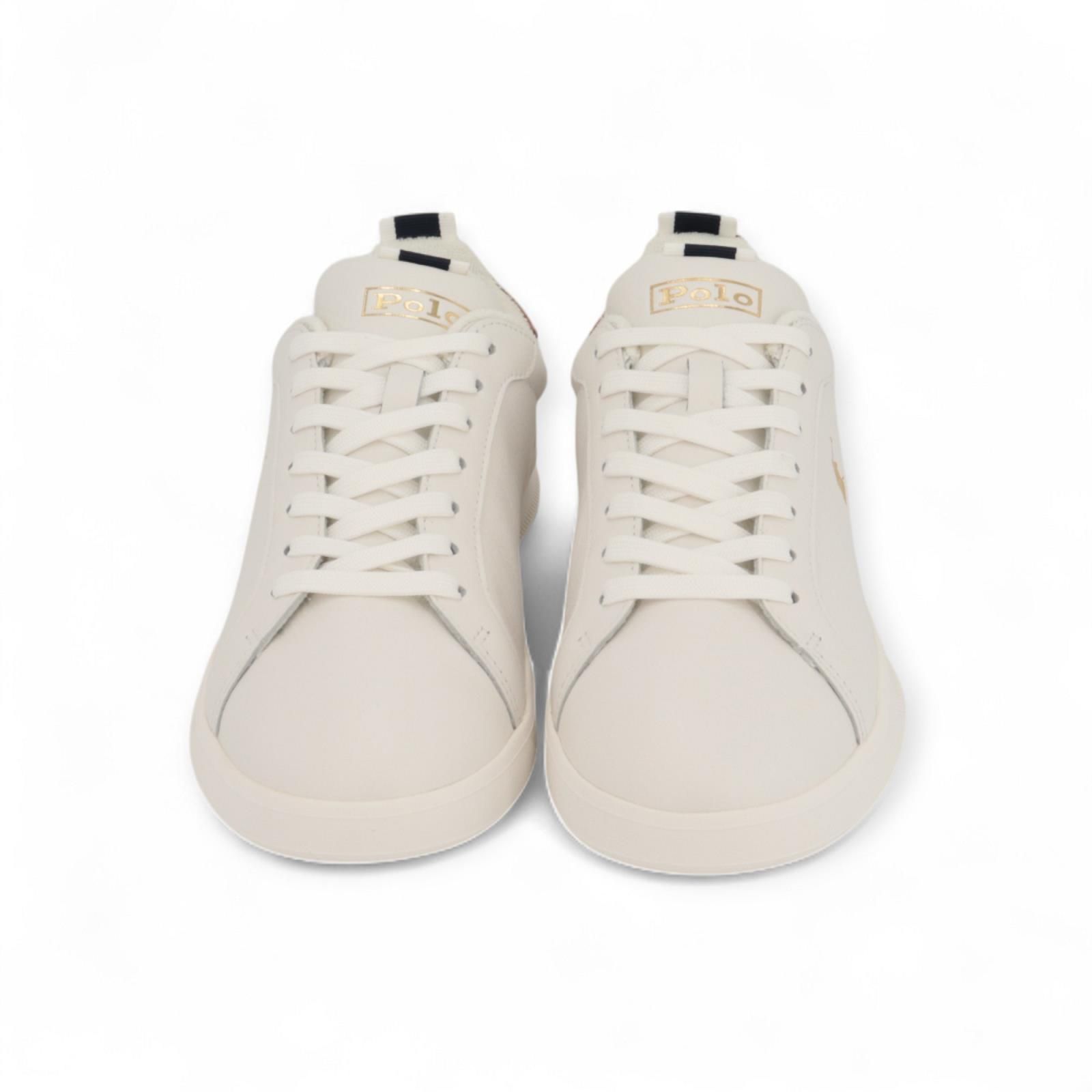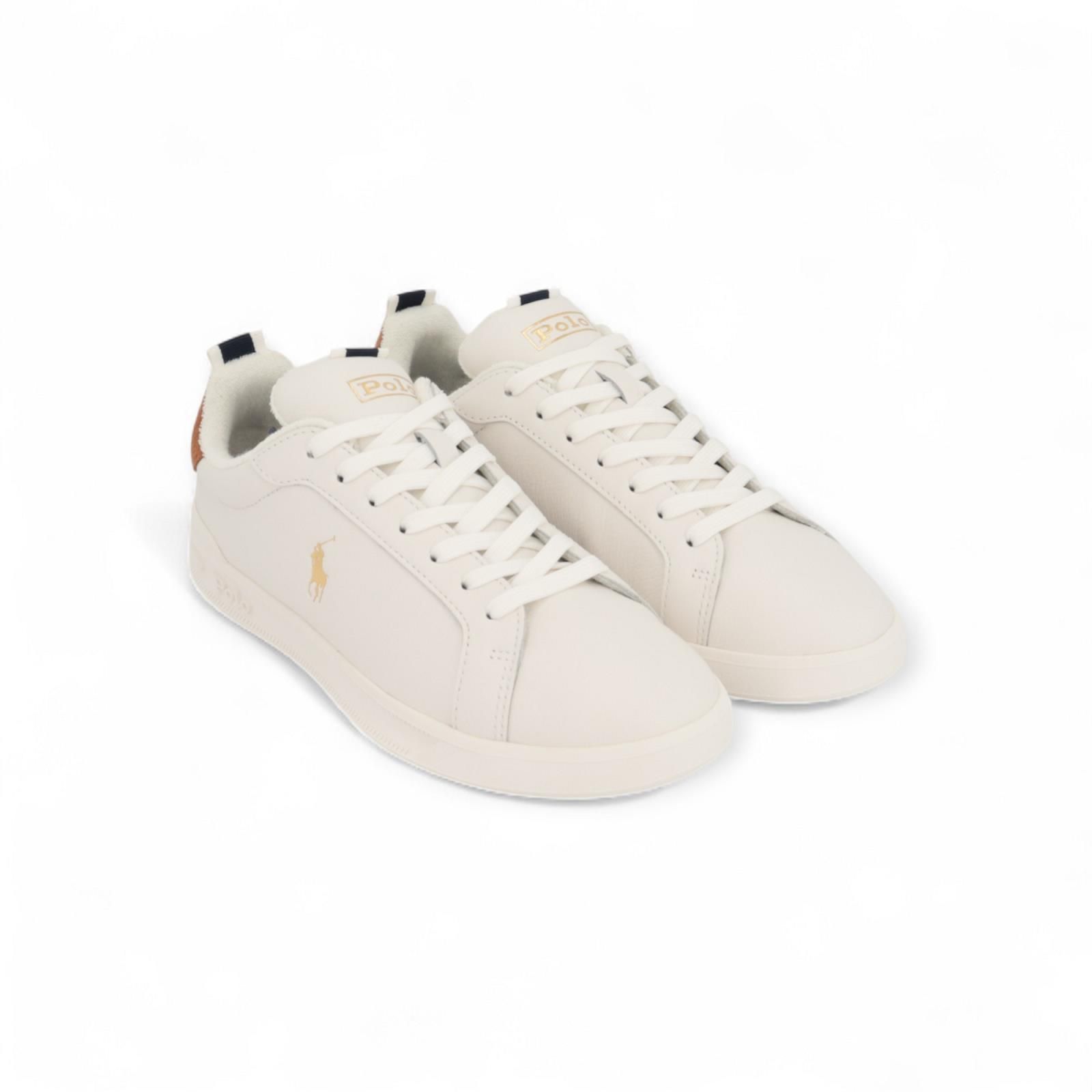 Sneaker Heritage Court RIB ‘hrt’ van Polo Ralph Lauren voor heren. Deze sneaker is geinspireerd op schoenen die werden gedragen door vroegere tennisprofessionals. De sneaker is volledig in off wit leer. Afgewerkt met een cognac suède hielflap met gouden logo POLO en het iconische logo paardje aan de zijkant van de schoen.