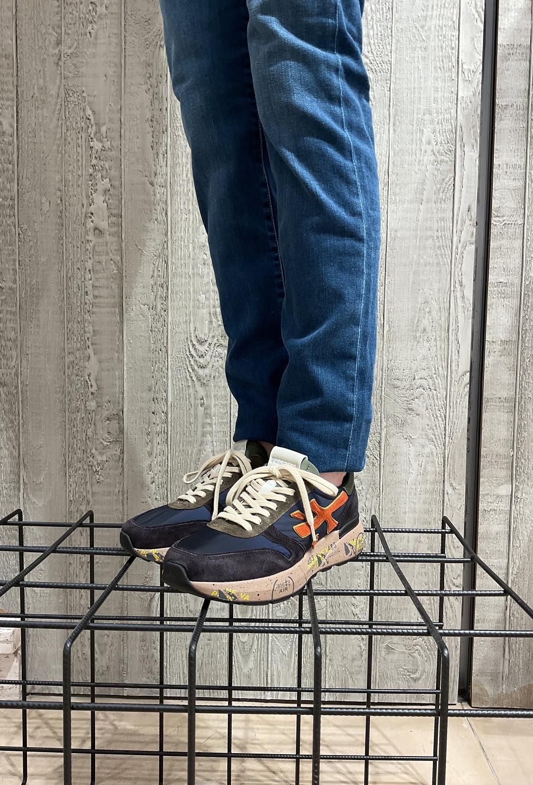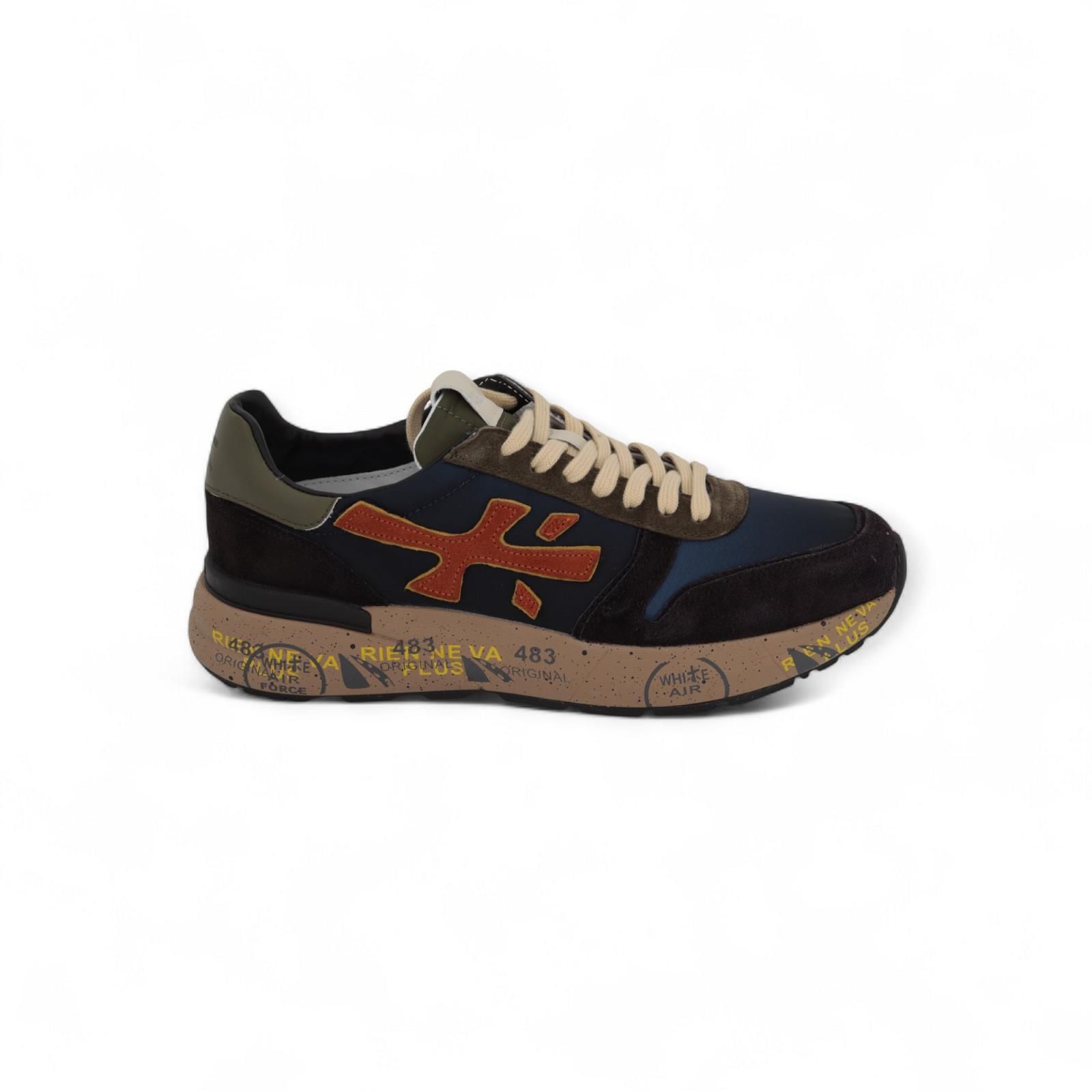Sneaker Mick Var 7721 van Premiata voor heren. Deze sneaker is in blauw / groen suède met nylon. Aan de zijkant is het premiata logo in oranje suède en mooi afgewerkt met groene hielflap. De zool is versterkt door de iconische stijldetails van Premiata en heeft een uitneembare binnenzool.
