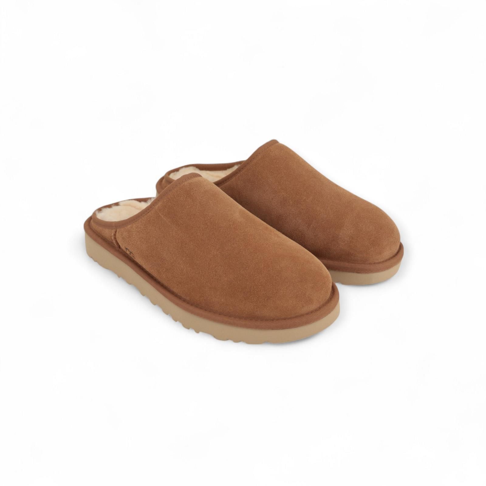 Pantoffel Classic Slip on van UGG voor heren. Deze pantoffel is in cognac (chestnut) suède met wol binnenin. De buitenzool is licht met een antislip afgewerkt met een stoffen bies rond de zool.