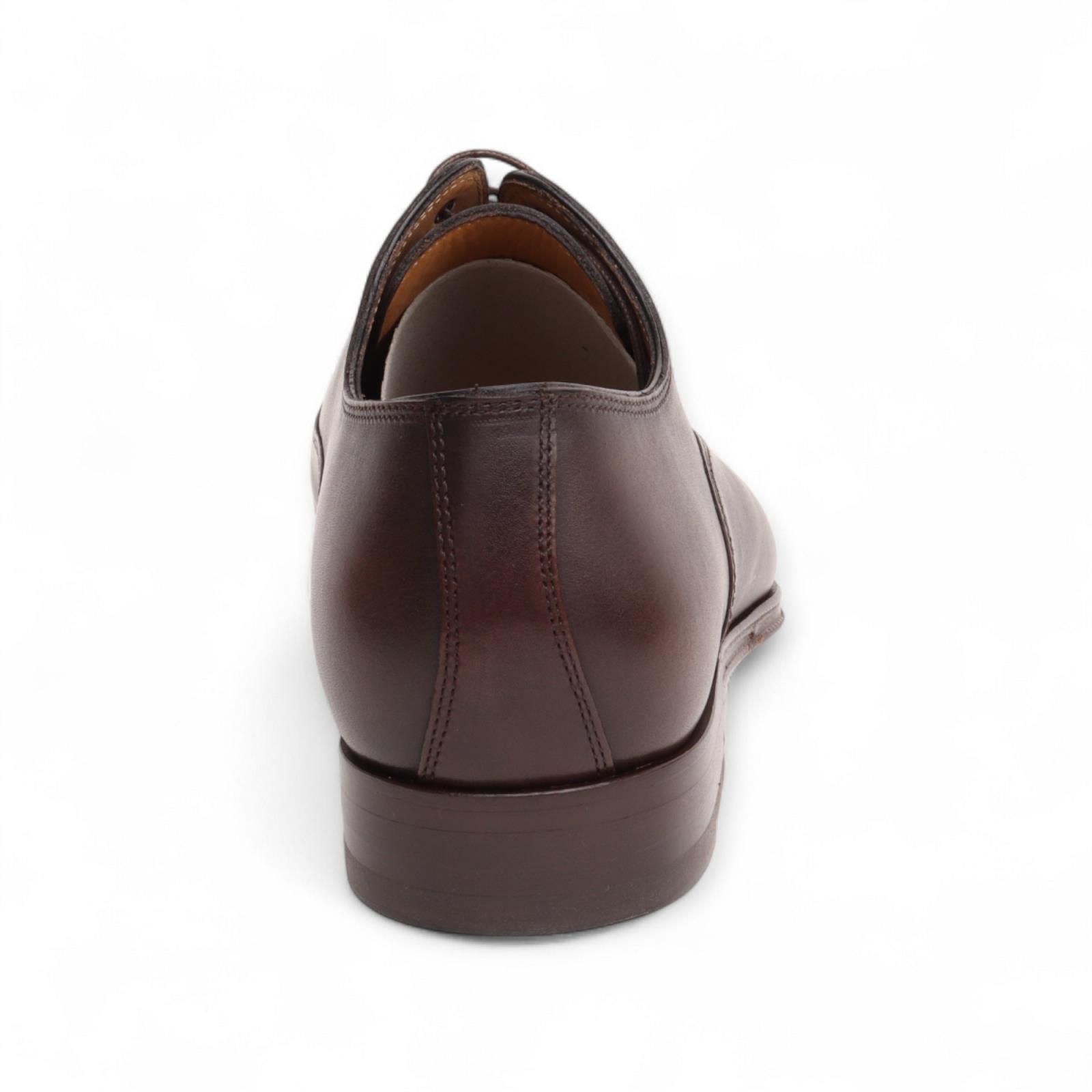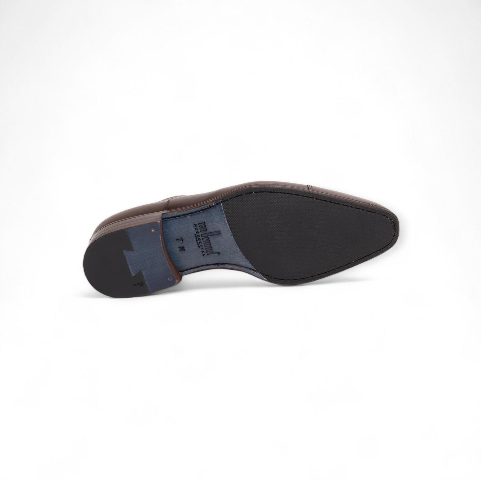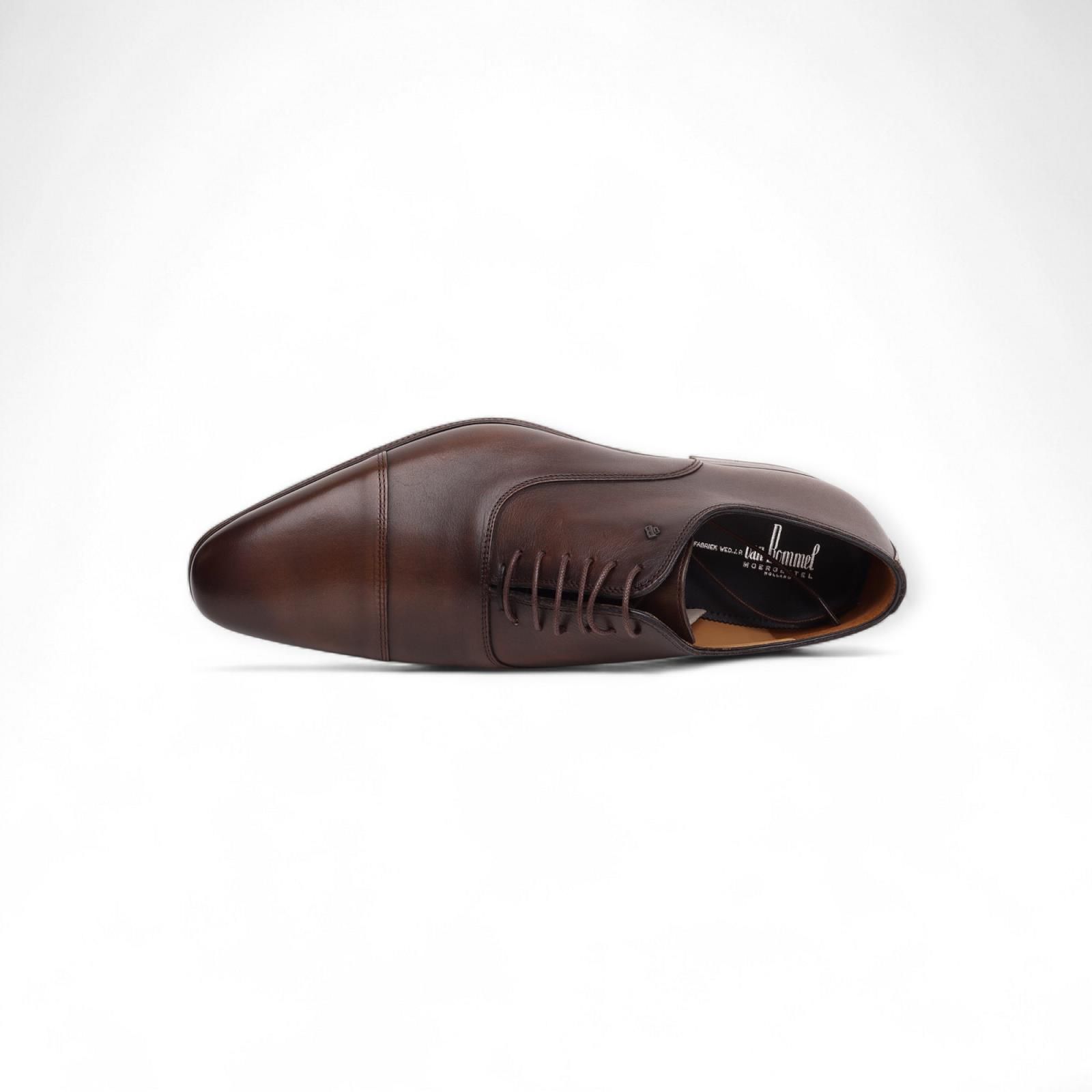 Deze heren schoen Raffa 02.01 van Van Bommel met rechte neuskap hoort bij de geklede collectie. De veterschoen heeft een zool met een fijn antislip profiel. Het deel dat tijdens het lopen het meest belast wordt is van slijtvast rubber. Om te voorkomen dat u met uw hak in de zoom van uw broek blijft steken is het puntje van de hak dat aan de binnenzijde zit afgeschuurd. Aan de zijkant van de schoen is bij het bovenste vetergaatje het iconische koperen VB'tje in het leer geslagen. De voering is volledig opgetrokken uit kwalitatief hoogwaardig kalfsleer. Het bovenwerk is gemaakt uit donkerbruin leer.