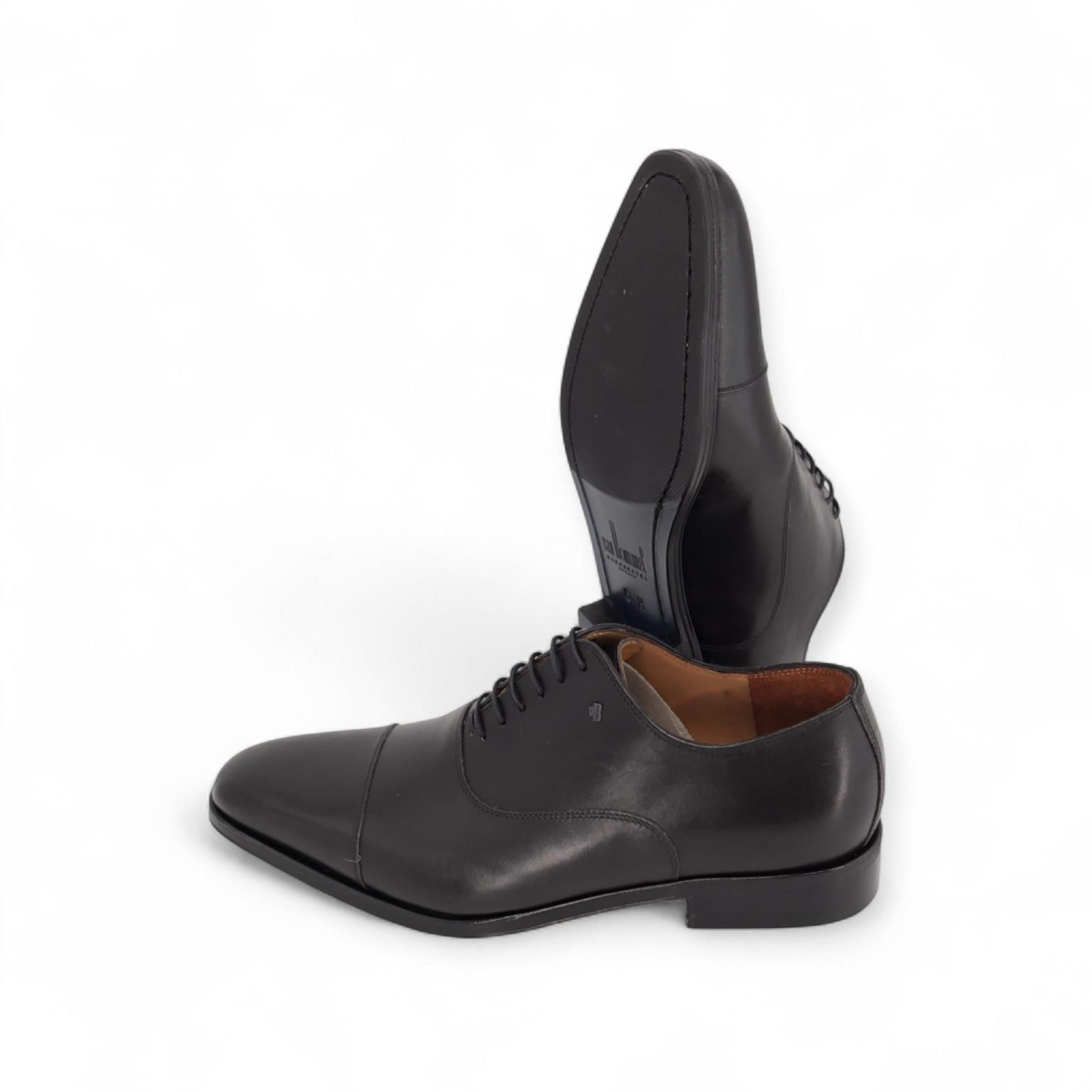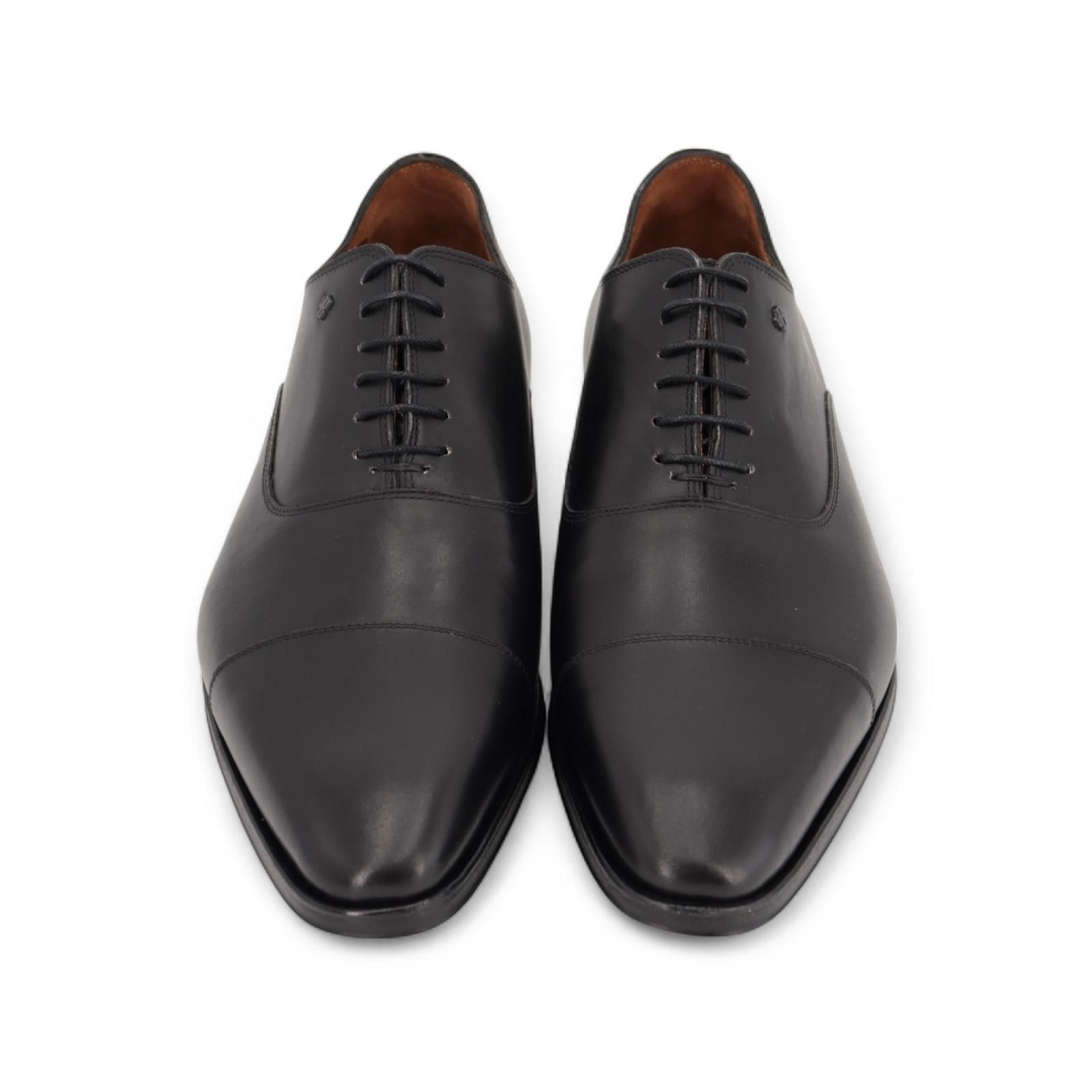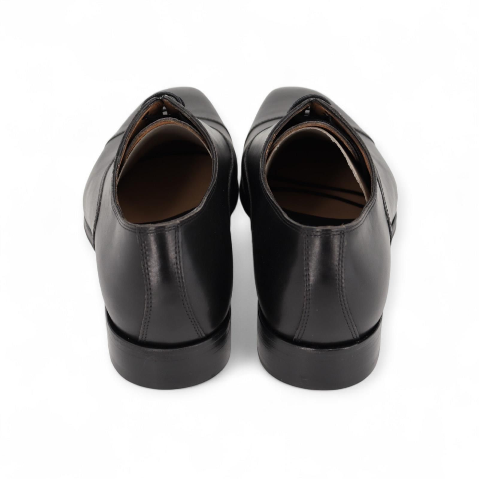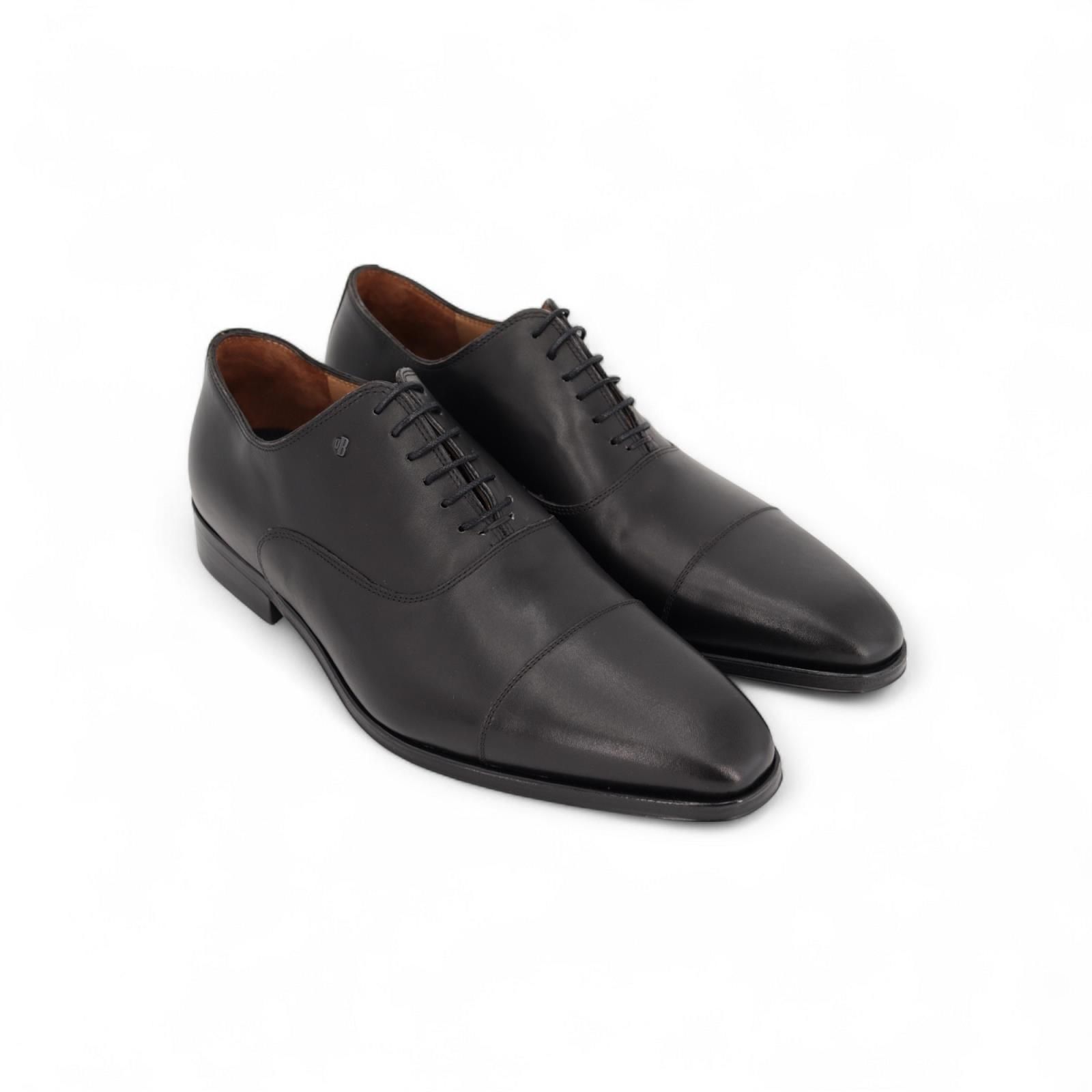 Deze heren schoen Raffa 02.02 van Van Bommel met rechte neuskap hoort bij de geklede collectie. De veterschoen heeft een zool met een fijn antislip profiel. Het geleng van de zool is van leer dat met de hand een stijlvolle finish laag heeft gekregen Het deel dat tijdens het lopen het meest belast wordt is van slijtvast rubber..Om te voorkomen dat u met uw hak in de zoom van uw broek blijft steken is het puntje van de hak dat aan de binnenzijde zit afgeschuurd. De lederen bovenrand van de schoen is hoogwaardig afgewerkt met een dunne paspoil. Aan de zijkant van de schoen is bij het bovenste vetergaatje het iconische koperen VB'tje in het leer geslagen. De voering is volledig opgetrokken uit kwalitatief hoogwaardig kalfsleer. Deze schoen is uitgevoerd in soepel zwart kalfsleer met een fijne nerf en een rijke zijdeglans.