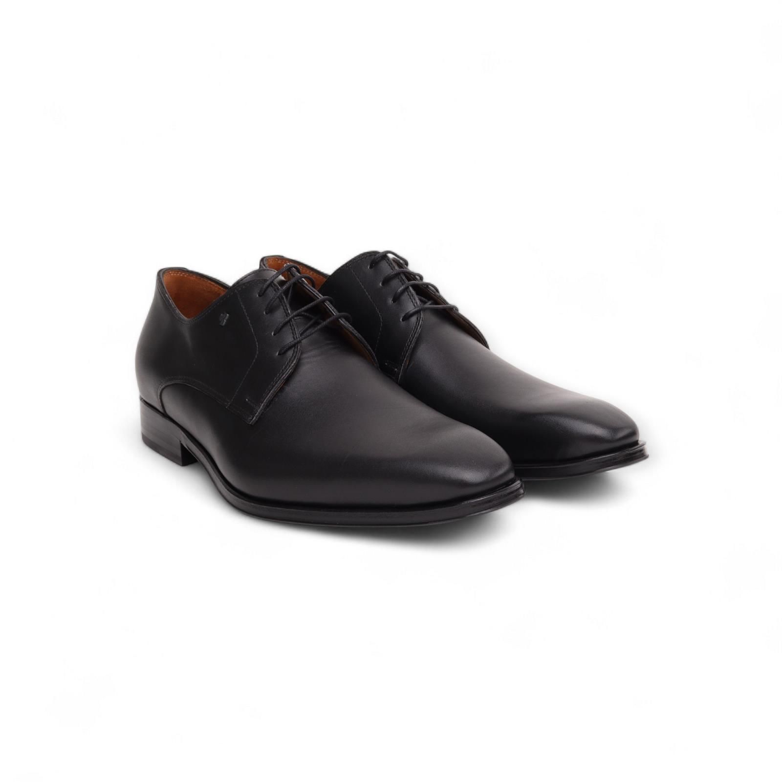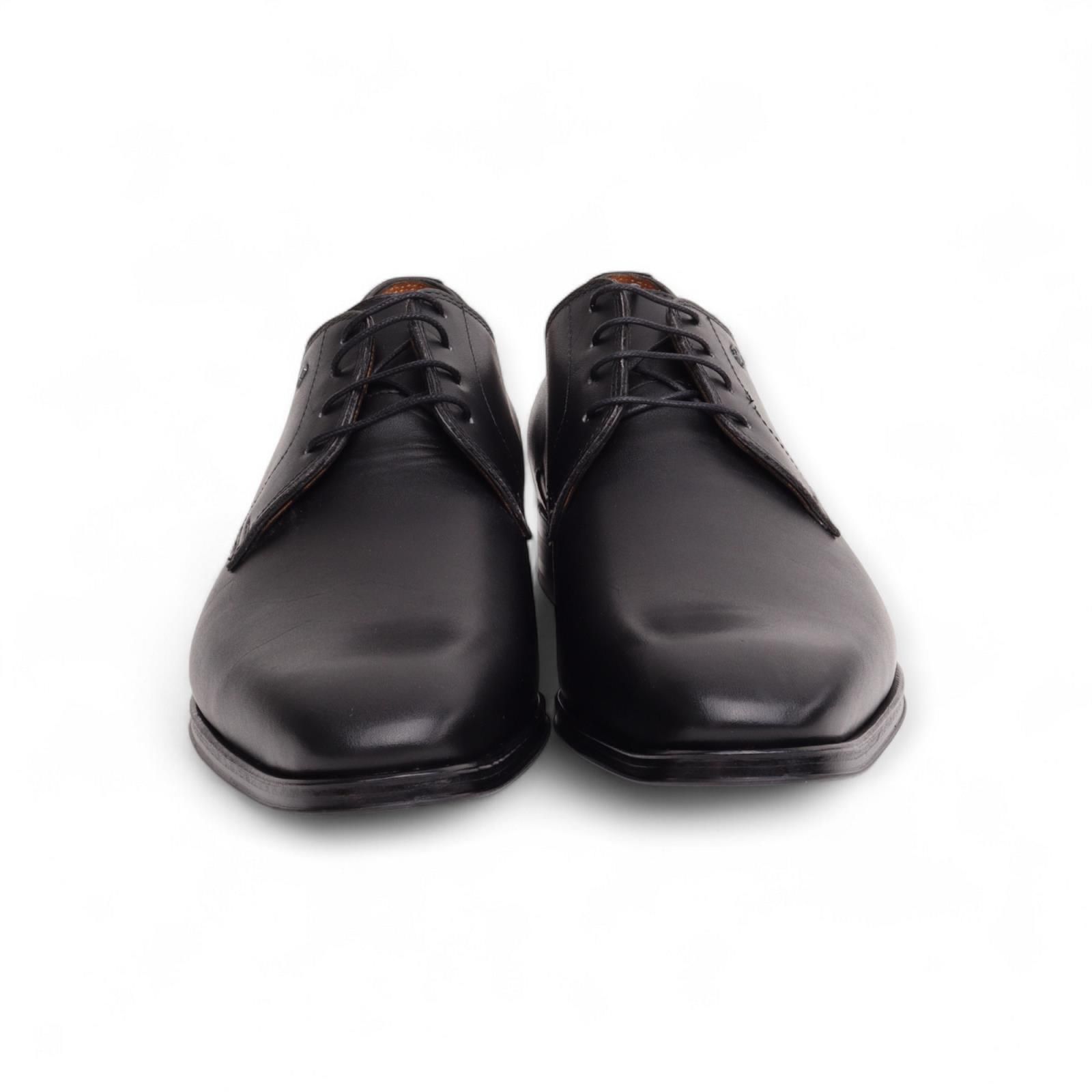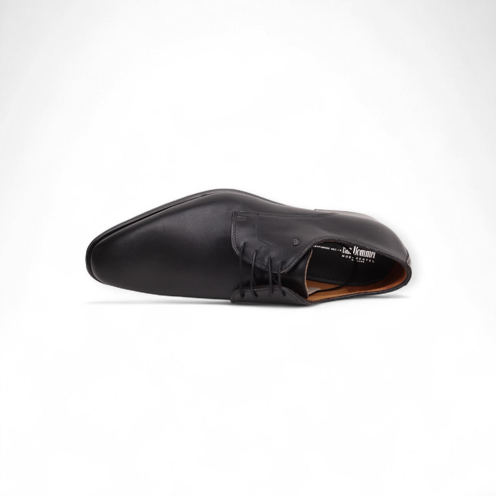 Deze herenschoen Raffa 03.01 van Van Bommel volledig effen hoort bij de geklede collectie. De veterschoen heeft een zool met een fijn antislip profiel. Het deel dat tijdens het lopen het meest belast wordt is van slijtvast rubber. Om te voorkomen dat u met uw hak in de zoom van uw broek blijft steken is het puntje van de hak dat aan de binnenzijde zit afgeschuurd. Aan de zijkant van de schoen is bij het bovenste vetergaatje het iconische koperen VB'tje in het leer geslagen. De voering is volledig opgetrokken uit kwalitatief hoogwaardig kalfsleer. Deze schoen is uitgevoerd in mooi klassiek, zwart leder.