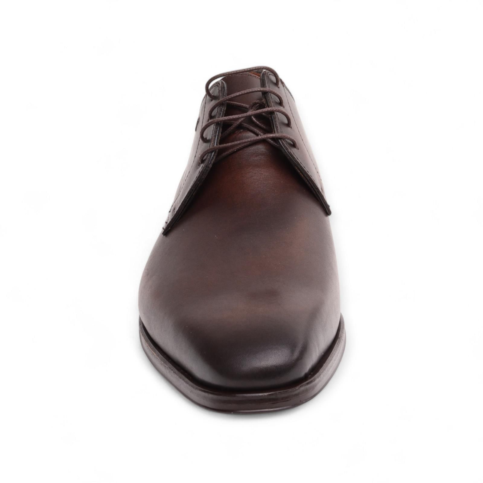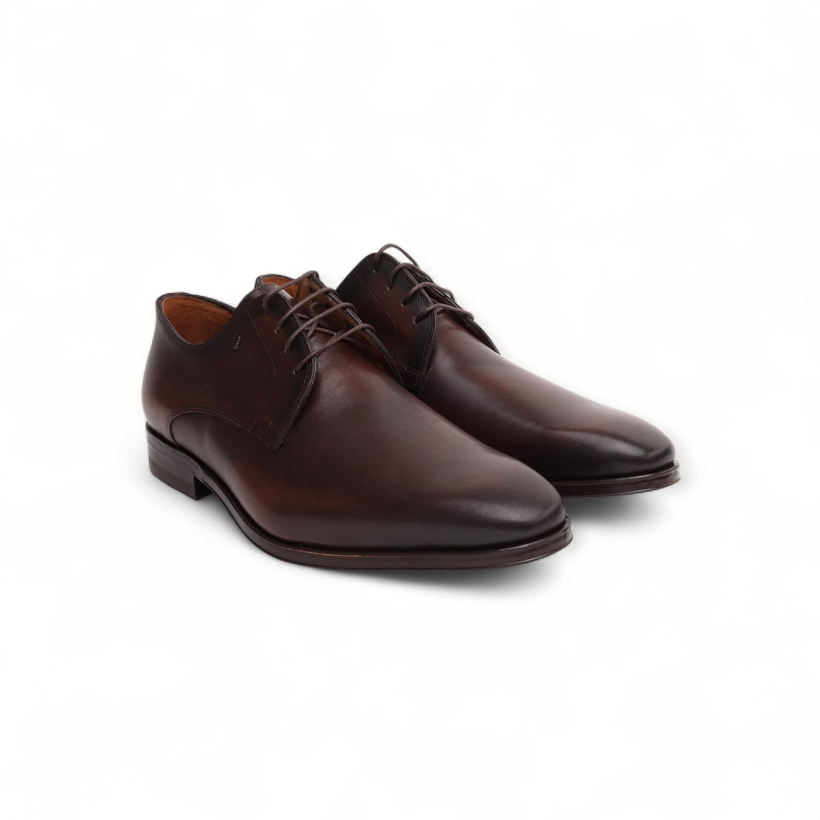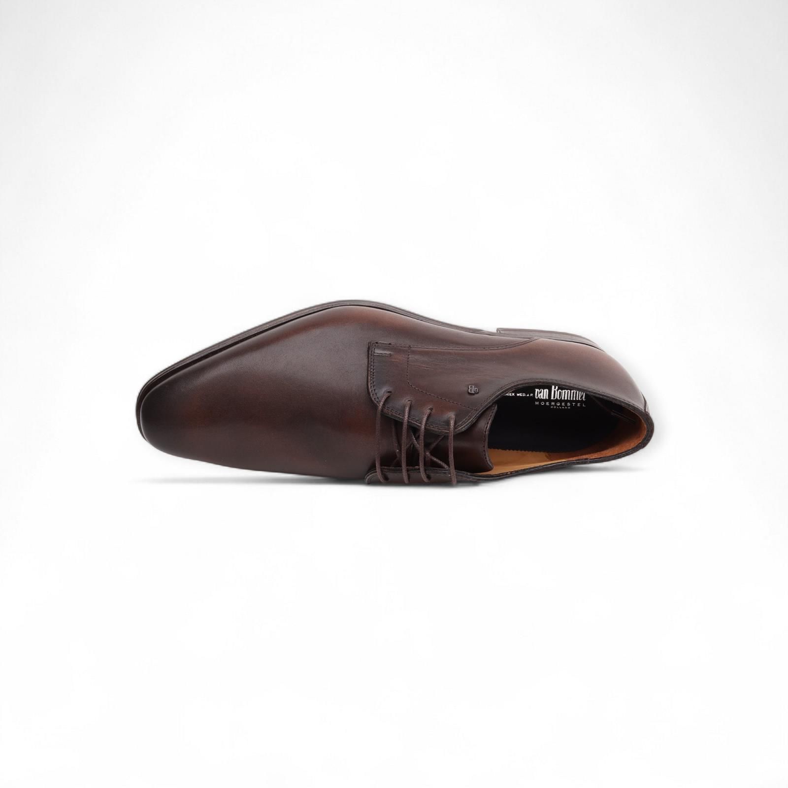 Deze herenschoen Raffa 03.07 van Van Bommel volledig effen hoort bij de geklede collectie. De veterschoen heeft een zool met een fijn antislip profiel. Het deel dat tijdens het lopen het meest belast wordt is van slijtvast rubber. Om te voorkomen dat u met uw hak in de zoom van uw broek blijft steken is het puntje van de hak dat aan de binnenzijde zit afgeschuurd. Aan de zijkant van de schoen is bij het bovenste vetergaatje het iconische koperen VB'tje in het leer geslagen. De voering is volledig opgetrokken uit kwalitatief hoogwaardig kalfsleer. Deze schoen is uitgevoerd in mooi klassiek, donker bruin leer.