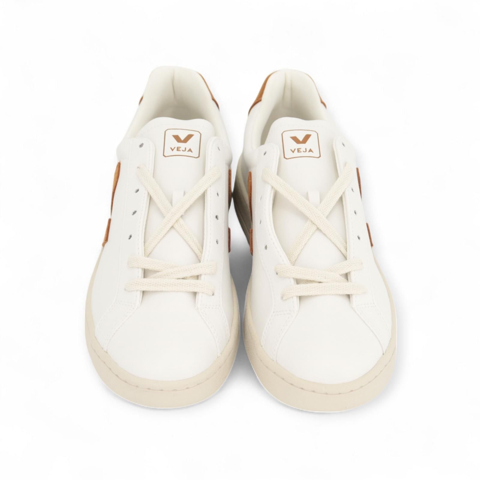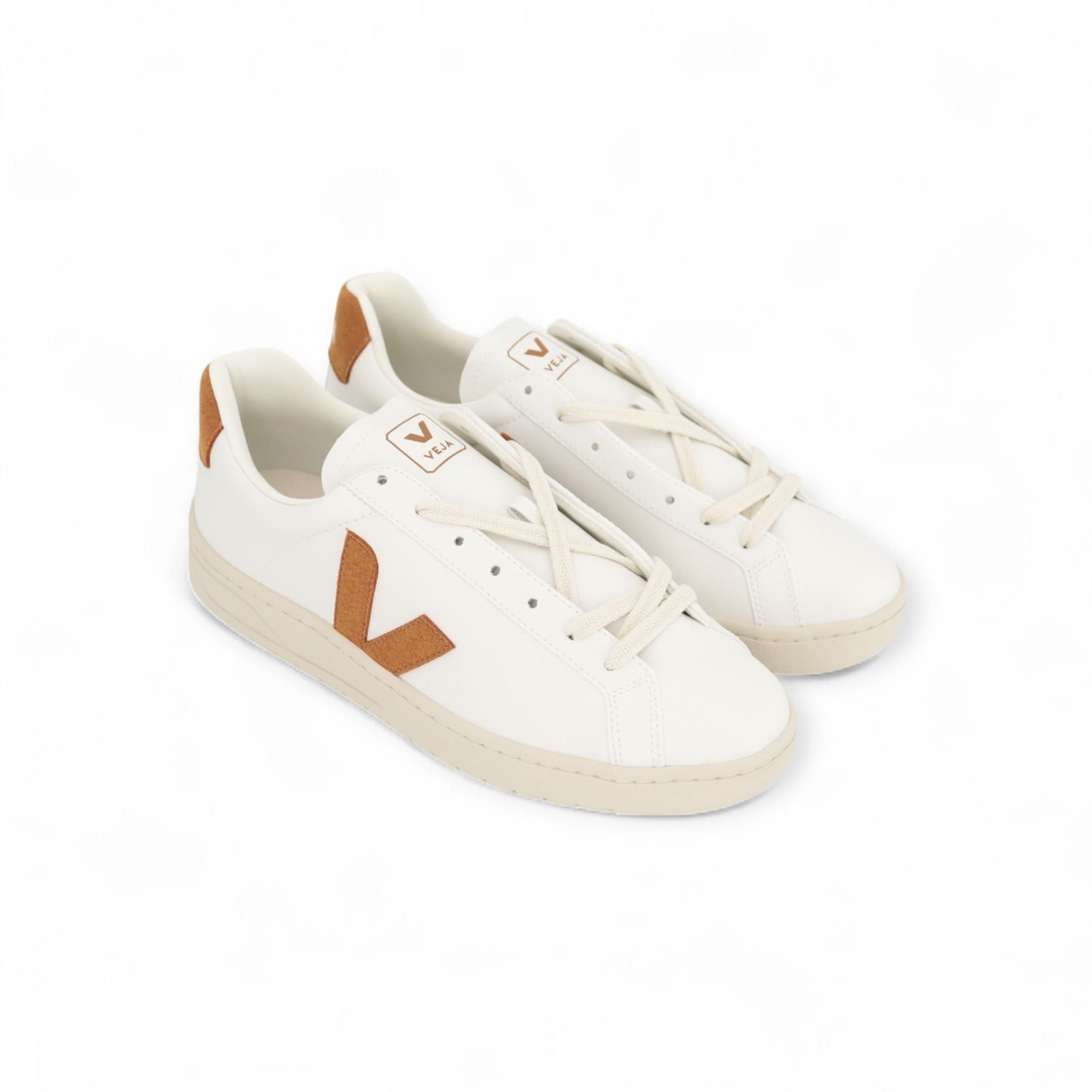 Deze wit met cognac Urca sneaker van Veja met de bekende V in beige is 100% ecologisch! Ze hebben een vaste zool die minder plooibaar zijn dan de Esplars. Dit model heeft een uitneembare zool.