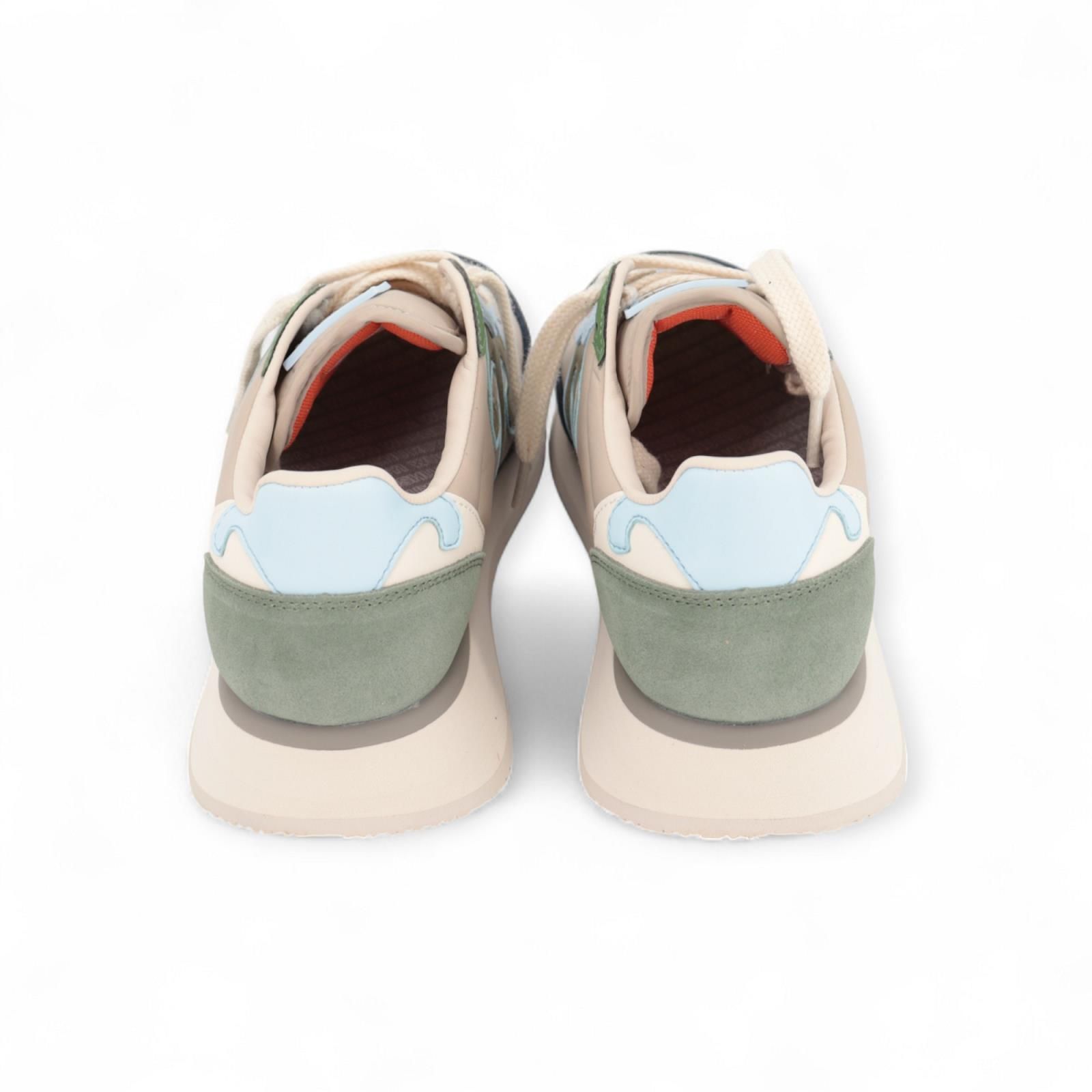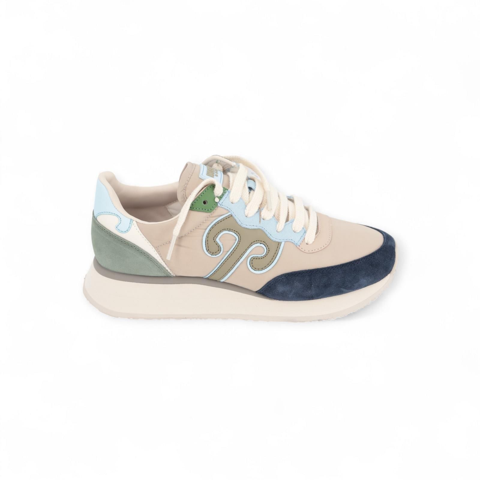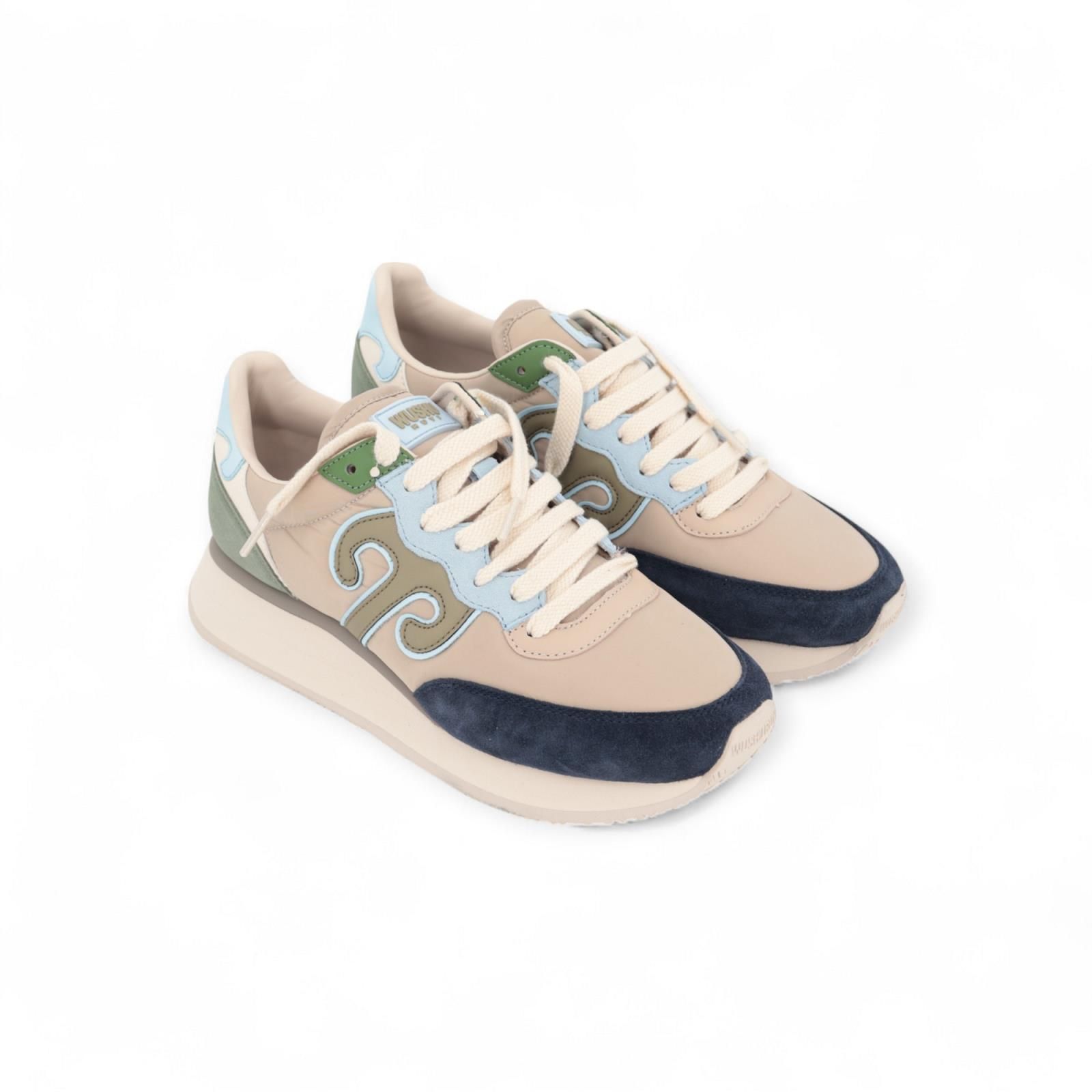 Sneaker Master van Wushu voor heren. Deze runner is uitgevoerd in blauw/ kaki suède met beige. Afgewerkt met aan de hiel wit/blauw leder. Aan de zijkant van de schoen vind je hun kenmerkende RUYI teken in kaki: het Chinees symbool van geluk. Is op een lichte sleehak van 4cm en heeft een uitneembare binnenzool. Extra toegevoegd: groene veter.