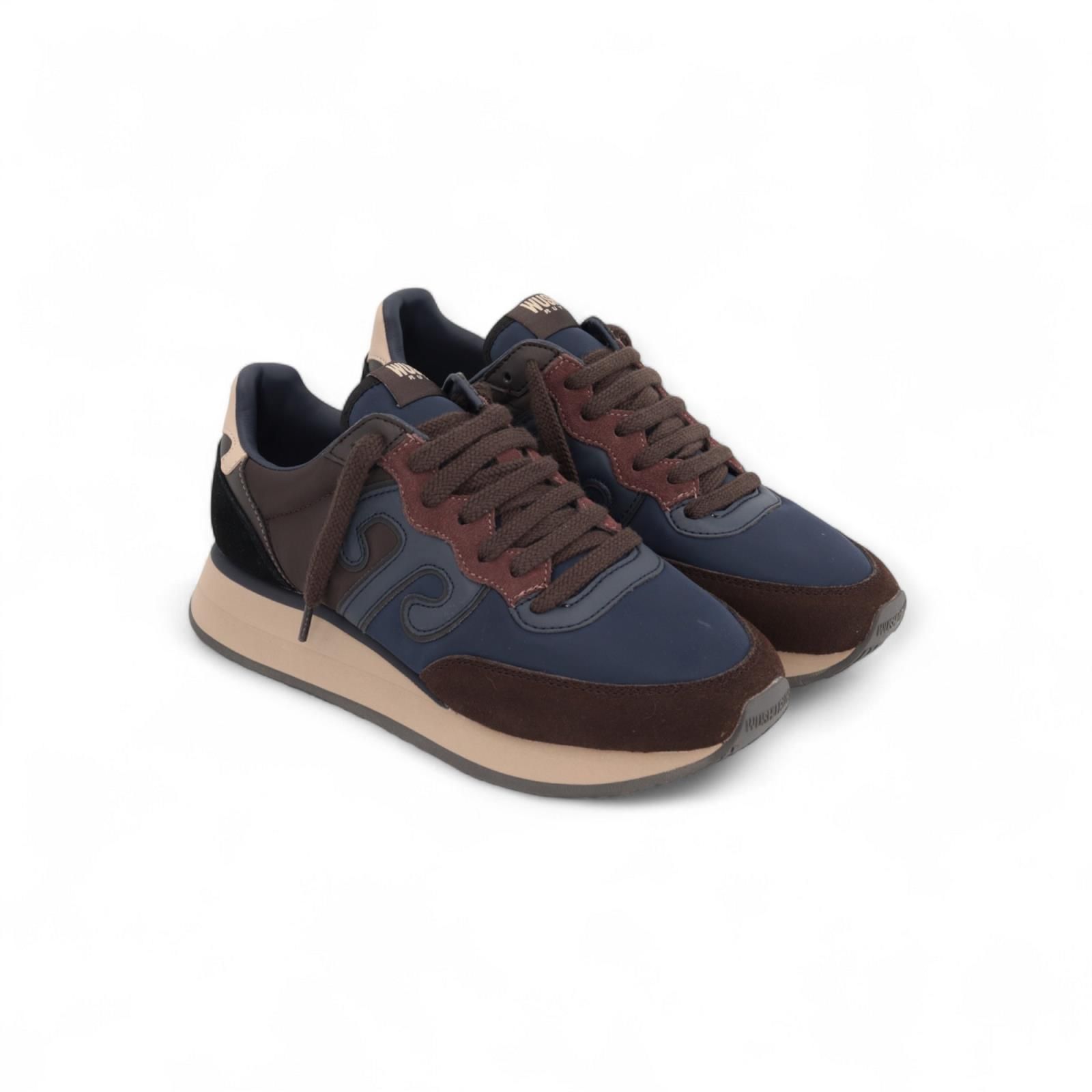 Sneaker Art Master van Wushu Ruyi voor heren. Deze runner is uitgevoerd in blauw en bruin nylon met lederstukken. Aan de zijkant van de schoen vind je hun kenmerkende RUYI teken: het Chinees symbool van geluk. Is op zool van 4cm en heeft een uitneembare binnenzool. Extra toegevoegd: blauwe veter.