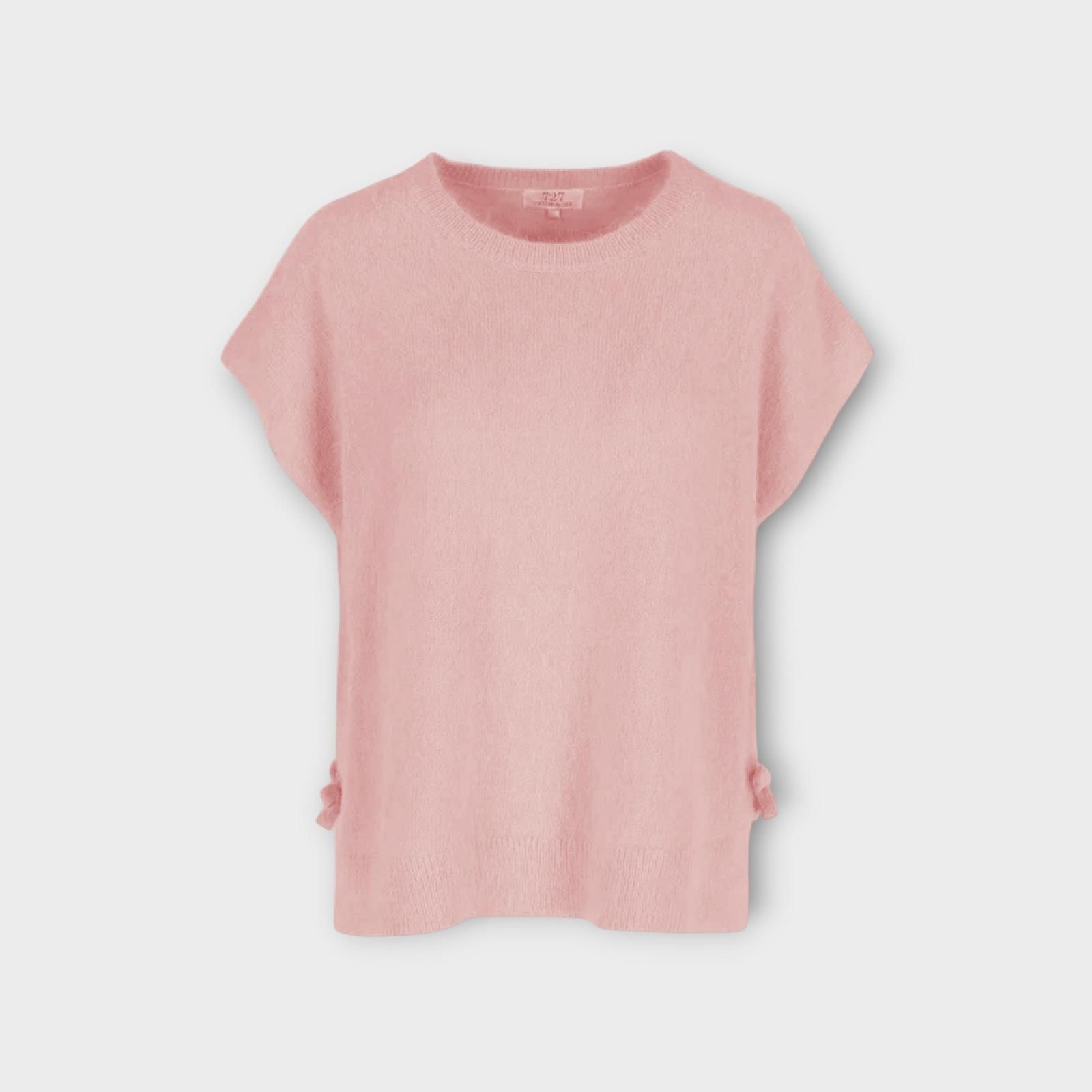 Trui Rosalie van Cycleur De Luxe voor dames. Deze gebreide top is in roze met korte mouwen. Versierd met delicate strikken aan de zijkanten en gemaakt van een luxueuze mix van 65% angora en 35% nylon. Belooft ongeëvenaard comfort , stijl en een zacht gevoel op de huid. Makkelijk als trui te gebruiken of als top.