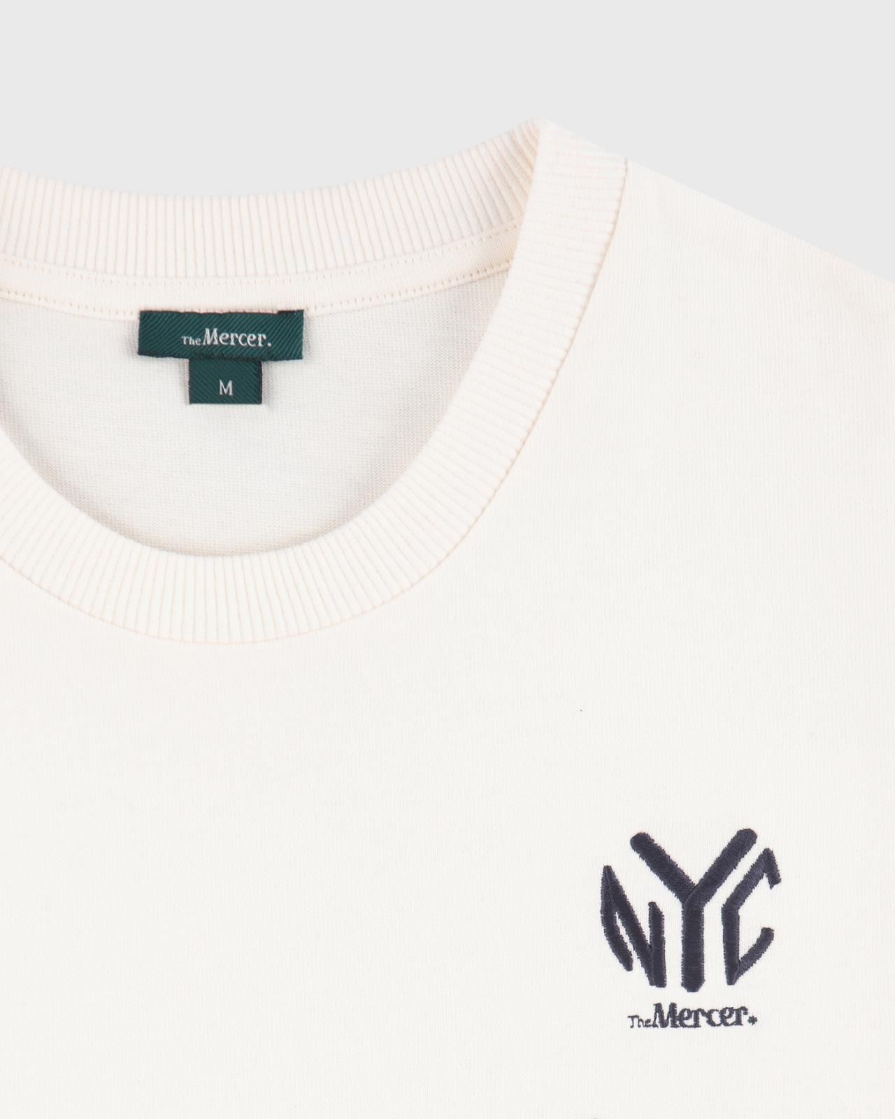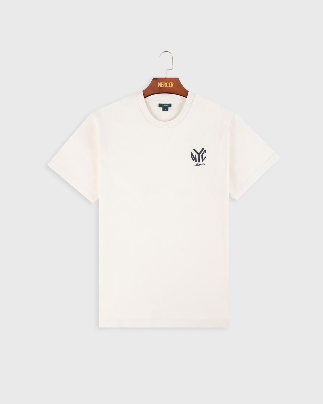 T-shirt The Subway Tee van Mercer voor dames en heren. Deze T-shirt in off wit is gemaakt van 100% biologisch katoen. Met het the Mercer NYC logo op de borst in blauw. Deze t-shirt is unisex. Combineer deze t-shirt met bijpassende sweater.