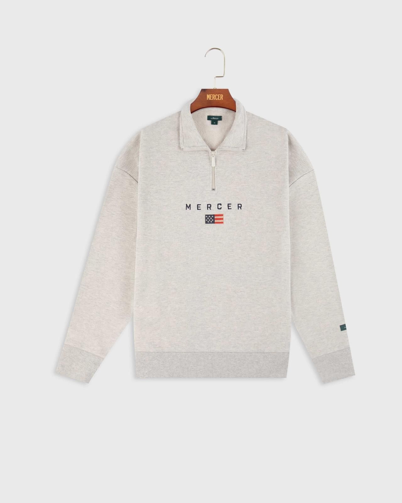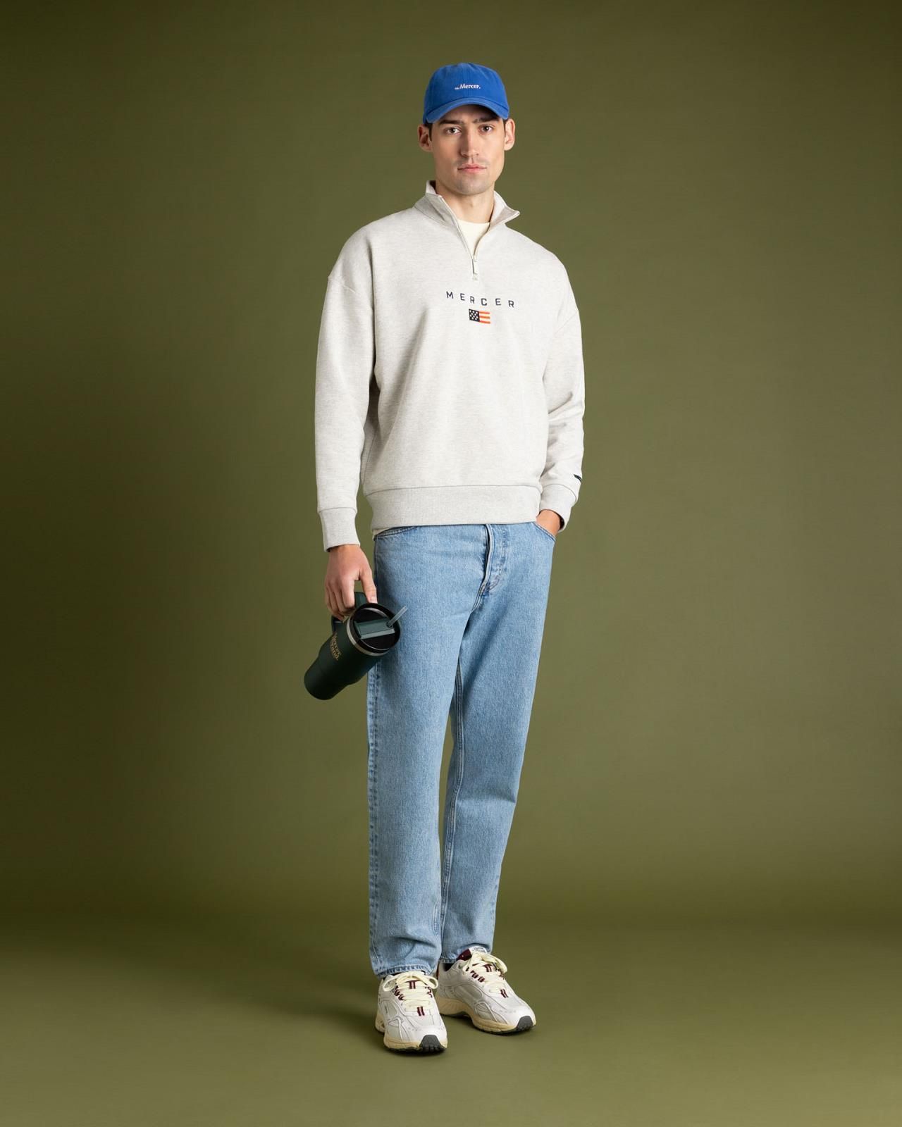 Sweater The Mercer Quarter Zip van Mercer voor dames en heren. Deze sweater in grijs is een comfortabele basic, gemaakt van 100% Amerikaans katoenfleece met omgekeerd weefstructuur. Is afgewerkt met een halve rits ‘zip’ en een opstaande kraag met logo en vlag in het midden. Deze quarter zip heeft een oversized pasvorm.